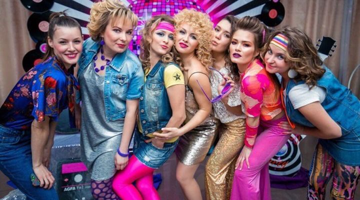 Полная противоположность данному стилю это легкое сочетание белых тонов с яркими аксессуарами. Девушки одевали оверсайз свитера, мини-юбки, колготки «дольчики» черного или ярких цветов, туфли-лодочки, разноцветную пластмассовую бижутерию и накидывали на плечи джинсовую куртку или большой массивный мужской пиджак.